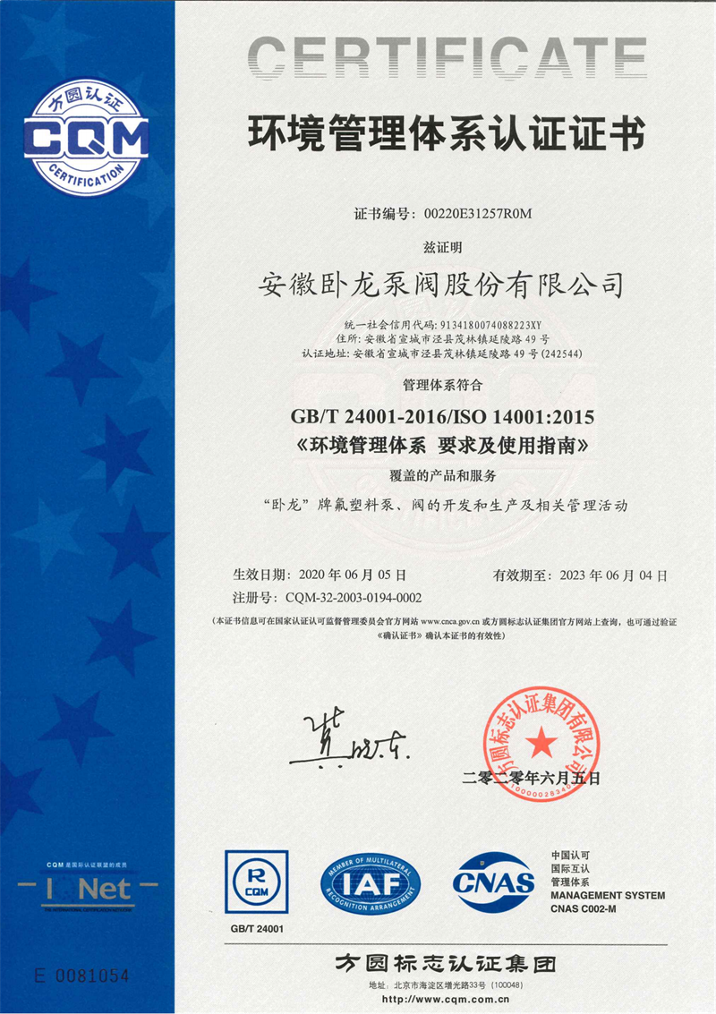 安徽臥龍泵閥股份有限公司位于風(fēng)景秀麗的江南古鎮(zhèn)——安徽省涇縣茂林鎮(zhèn)。公司前身涇縣氟塑料制品廠創(chuàng)建于1985年,是國內(nèi)較早引進(jìn)中科院上海有機(jī)化學(xué)研究所專利材料——"氟塑料合金",并以此耐腐蝕材料專業(yè)生產(chǎn)制造化工泵、閥、襯氟管道等產(chǎn)品的企業(yè)。公司經(jīng)過歷次的改制變革,2015年更名為安徽臥龍泵閥股份有限公司。